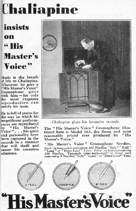Chaliapine endorses HMV products in an advertisement from the 1931 HMV record catalogue.