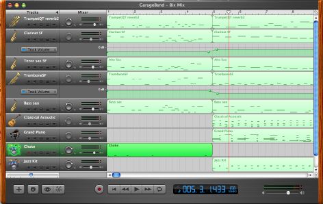 Following on from the jazz mock-up I posted on August 29th, I have now done some more experimenting with Apple's GarageBand music program. It amuses me to use all this modern software and hardware to create a pastiche of popular music of 80 years ago - in this case the Bix Beiderbecke/Frankie Trumbauer small groups of the late 1920s: which is why this piece is called The Bix Mix. All the instruments are created in software (no Apple loops were used this time), either from instruments already in GarageBand, QuickTime Instruments, or Soundfonts, and were played on an Evolution MK149 keyboard (the piano solo was played on a Yamaha digital piano - used only as a MIDI keyboard - because it has the full 88 keys). 3 mins 37 secs, 5 MB (stereo) | |