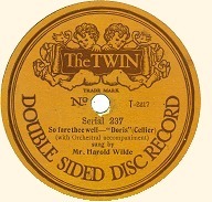 Small beginnings![]() Our family's first gramophone was given to us probably around 1949: it had an electric pickup that you connected to the radio and a wind-up motor. With it there were three obviously quite old records on the 'Twin' label - two of Christmas carols sung by 'A Church Choir' (four people) and two maudlin Victorian songs (see label, right). My father said they were probably 40 years old - a pretty accurate guess as it turned out since they dated from around 1910. Their sheer age fascinated me (40 years seemed an awfully long time then), and started me looking in junk shops for other old records: even before I left school I had collected quite a few interesting examples. And I kept at it... now I have over 1,600 78s chosen both for their content and their value as artefacts. The collection also includes CDs and gramophone records of classical music and classic (pre-war) jazz, as well as comedy recordings, including a lot of old music-hall, and a large number of Goon Shows. You can listen to an excerpt from this record (if you really want to): ![]() 'So Fare The Well' from Doris by Cellier, (excerpt) sung by Mr. Harold Wilde. Twin 235, recorded 1910. Posted: Fri - April 20, 2007 at 09:31 AM by Roger Wilmut |